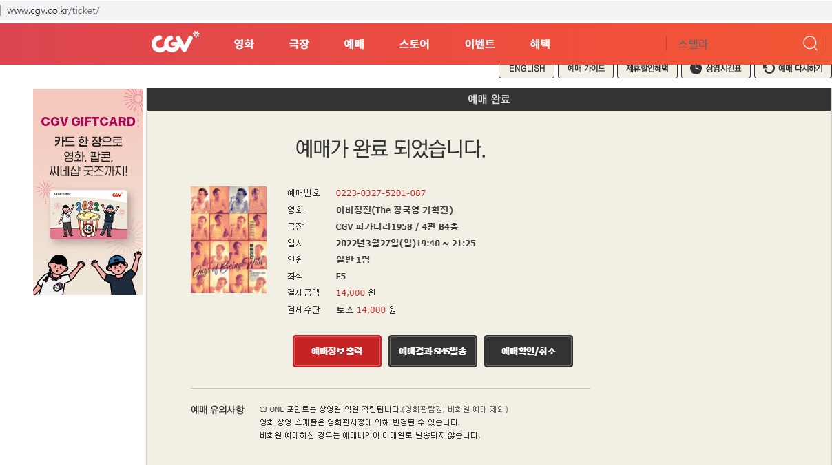 입장권이 필요한 건 아니지만, 기념 삼아 출력했는데 요즘은 이렇게 그냥 흰 종이에 출력이 되더라고요. 예전에는 길게 칼라로 나왔는데, 불필요해서 인지 심플하게 바뀌었네요. 아무튼 오랜만에 본 아비정전 스토리 리뷰해볼게요.